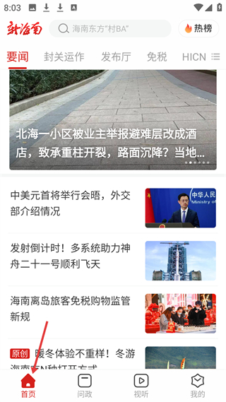 1、首頁有搜索欄和多板塊,推送北海小區、中美元首會晤等新聞,還有海南免稅新規、冬游海南本地資訊。