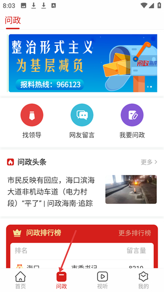 2、問政界面,有找領導、網友留言等功能入口,推送問政頭條和問政排行榜,方便用戶參與海南本地政務互動和問題反饋。