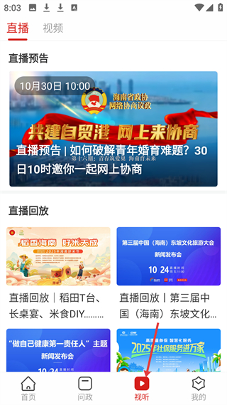 3、視聽界面,有直播和視頻分類,展示直播預告和回放,涵蓋海南省政協網絡協商議政、海南好米節等內容,提供本地視聽資訊。