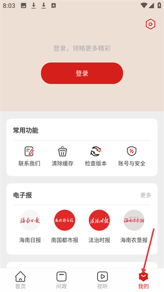 4、我的界面有登錄入口,提供聯系我們、清除緩存等常用功能,還有電子報板塊,可查看海南日報、南國都市報等本地報刊。