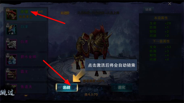 3、激活赤驥等坐騎,點擊出戰即可自動騎乘,坐騎能提升生命、防御等屬性,增強角色戰力。