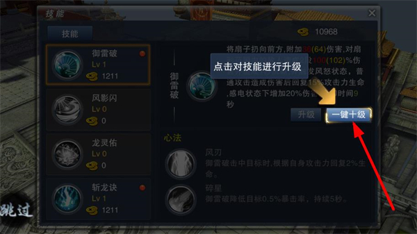 2、可對御雷破等技能進行升級,點擊一鍵升級可快速提升技能等級,增強技能傷害和效果。