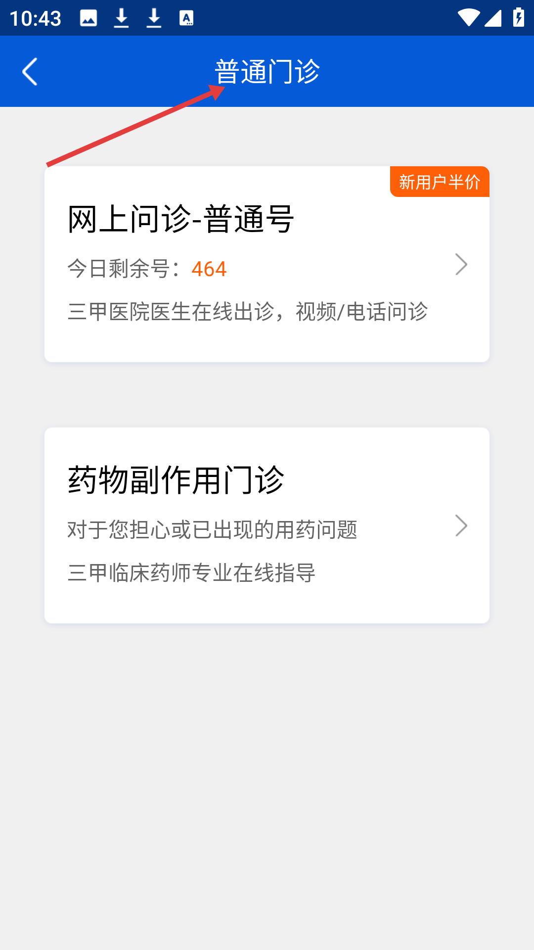 1、普通門診頁面,有網上問診普通號,新用戶半價,今日剩464號,三甲醫生在線,可視頻電話問診,還有藥物副作用門診,三甲藥師指導用藥問題。