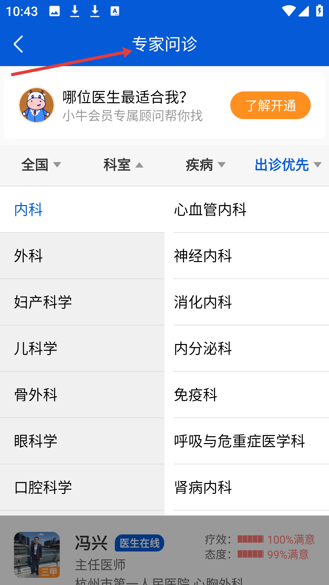 3、專家問診頁可找適配醫生,小牛會員有專屬顧問,能按全國、科室等篩選,涵蓋多科室,還展示三甲醫生馮興的滿意評價。