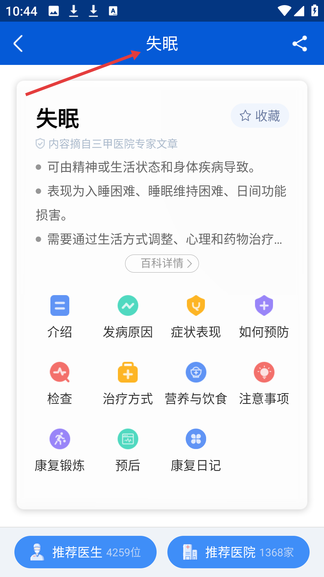 4、失眠介紹頁內容摘三甲專家文,講失眠成因、表現與治療,有發病原因、治療方式等板塊,還推薦超4000位醫生1300余家醫院。