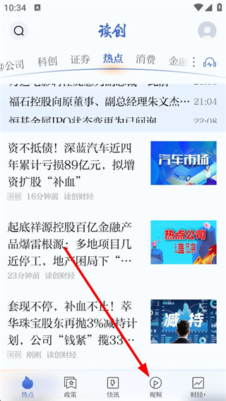 1、進入讀創應用的熱點頁面,可見科創證券等分類欄,展示多條財經資訊,底部設熱點政策等導航欄,點擊視頻按鈕,進入視頻板塊界面。
