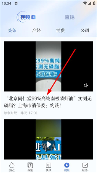 2、視頻板塊界面,有頭條產經等分類,展示相關視頻內容,找到對應資訊視頻,點擊該視頻,進入詳情播放頁面。