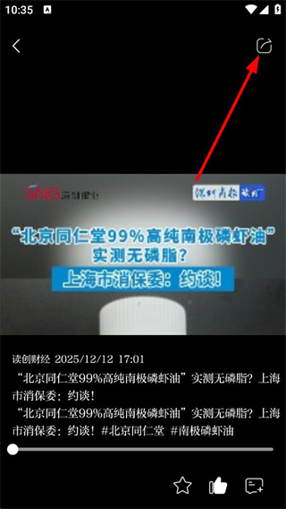 3、進入視頻詳情頁面,可查看資訊內容,頁面右上角有分享按鈕,點擊該按鈕,彈出包含多種渠道的分享選項界面。