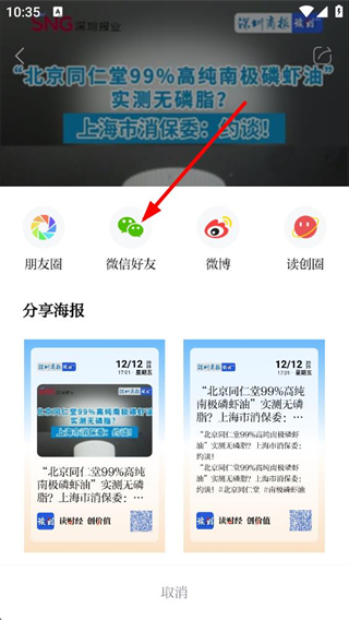 4、分享選項界面,有朋友圈微信好友等分享渠道,還有分享海報可選,選擇對應的渠道,即可完成資訊內容的分享操作。