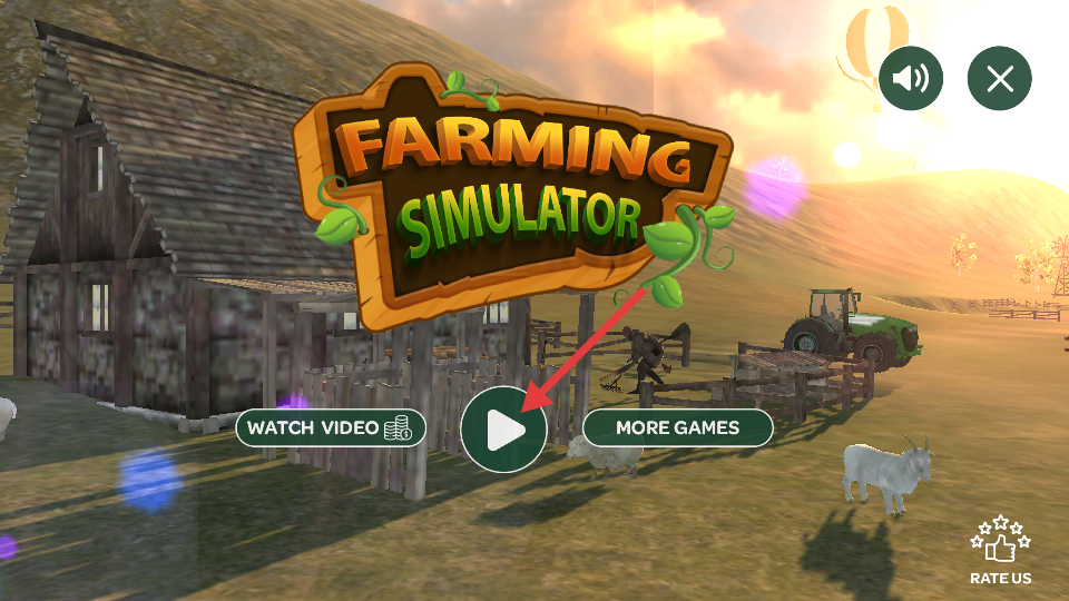 1、初始界面上有醒目的FARMING SIMULATOR標題,還有播放按鈕、觀看視頻獲取獎勵按鈕以及更多游戲選擇按鈕,點擊播放按鈕即可正式啟動游戲。