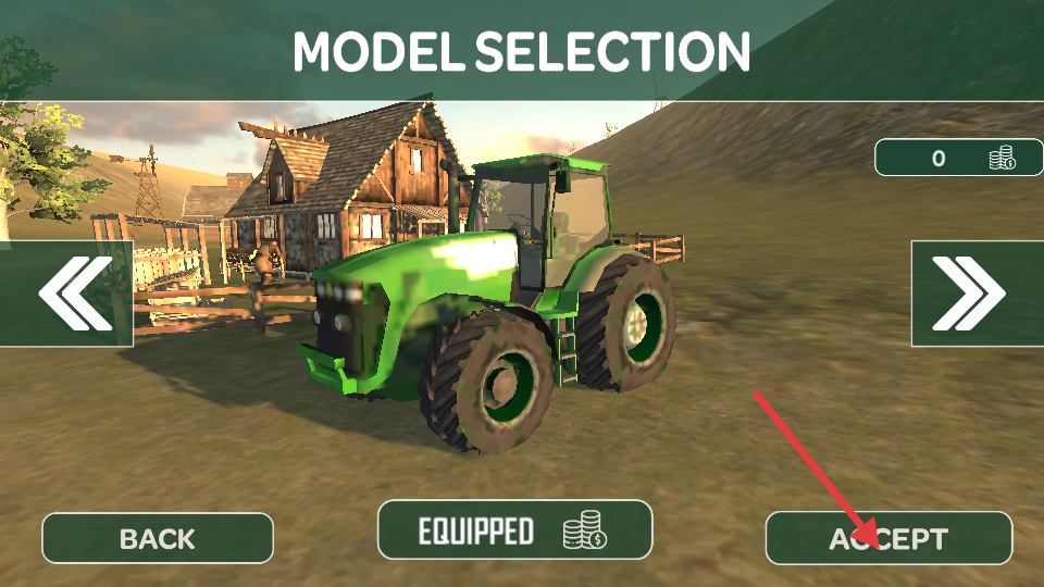2、啟動游戲后進入農機模型選擇界面,這里展示著不同的拖拉機等農機模型,你可以左右滑動選擇心儀的模型,選好后點擊ACCEPT按鈕,確認所選的農機模型。