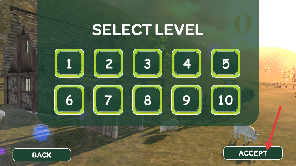 3、確認農機模型后進入關卡選擇界面,界面1到10上有從的關卡按鈕,你可以根據自己的游戲進度和挑戰需求,選擇相應的關卡進入該關卡對應的農場場景。