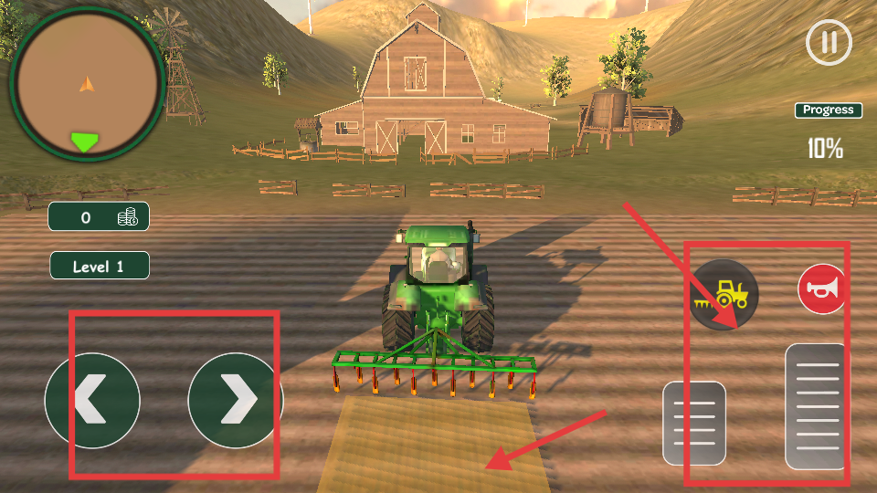 4、操控拖拉機進行耕作等作業,界面左側的左右箭頭按鈕用于控制拖拉機的行駛方向,右側的農機功能按鈕可切換不同的農機工具,比如犁地工具等。