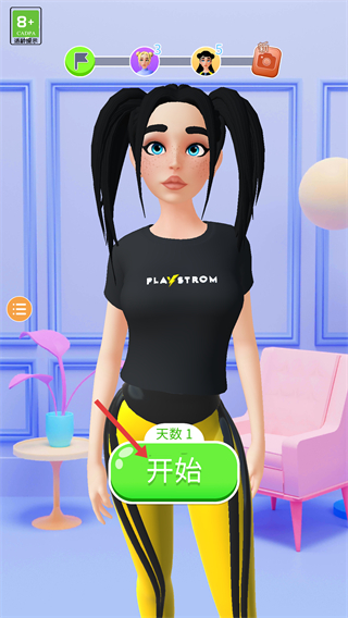 1、點擊開始按鈕進入游戲第一天的挑戰,開啟角色裝扮與社交互動的旅程體驗趣味玩法。