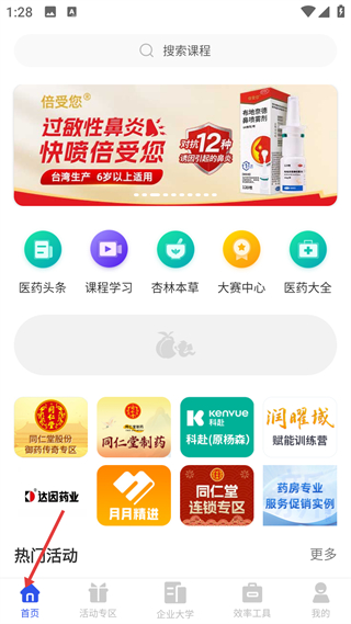 1、首頁設有搜索課程及醫藥頭條等功能入口,還展示品牌專區與熱門活動,是綜合功能集中展示頁,便于快速訪問核心服務。