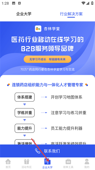 3、企業大學是醫藥在線學習B2B平臺,提供藥店組織能力建設等方案,通過學練結合,幫助從業者提升專業能力。