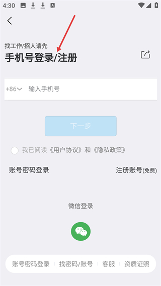 1、登錄界面,提示找工作或招人需先登錄,支持手機號、微信等方式,需勾選協議,含賬號密碼登錄及找回功能。