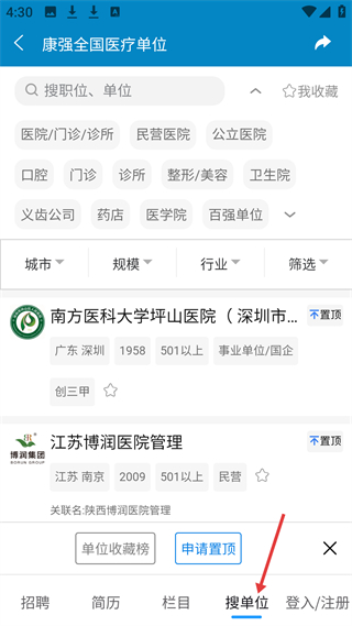 4、搜單位頁,可檢索醫療單位,分類涵蓋各類機構,支持按城市等篩選,展示單位信息,含收藏功能。