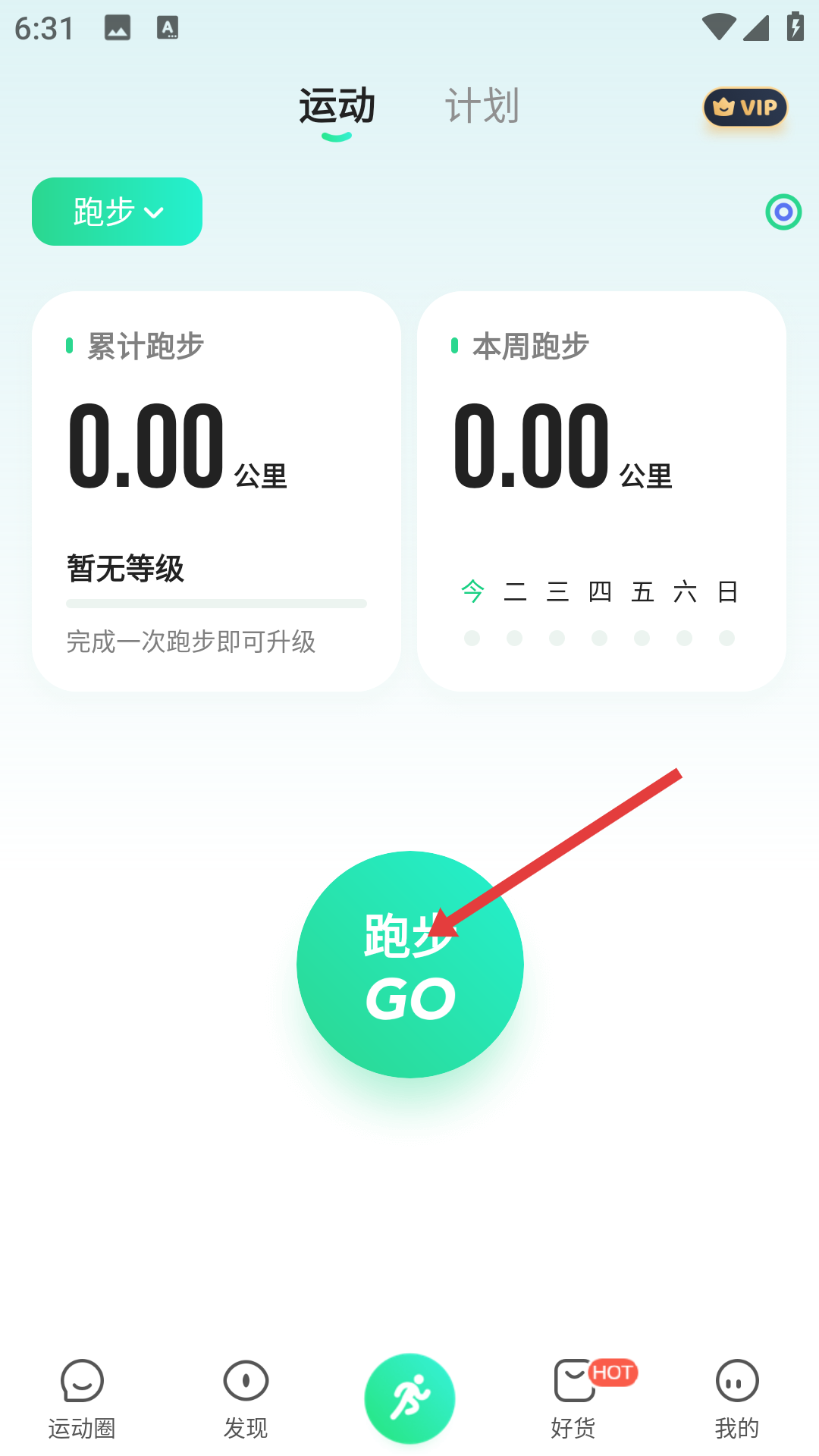 1、打開咕咚APP進入運動頁面,默認顯示跑步模式,上方呈現累計跑步和本周跑步的公里數、等級等信息,點擊中間顯眼的跑步GO綠色按鈕,即可進入跑步設置環節。