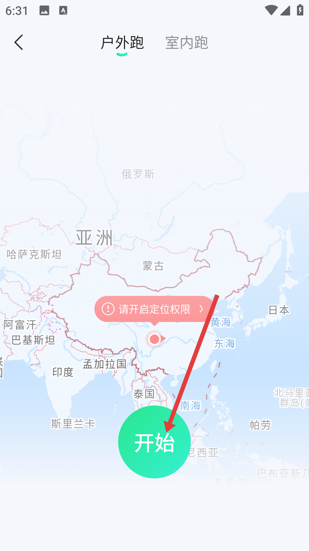 2、點擊跑步GO后進入跑步類型選擇頁,有戶外跑、室內跑選項,選戶外跑時需開啟定位權限,確認后點擊開始按鈕,APP將借助GPS定位,正式啟動跑步運動監測。