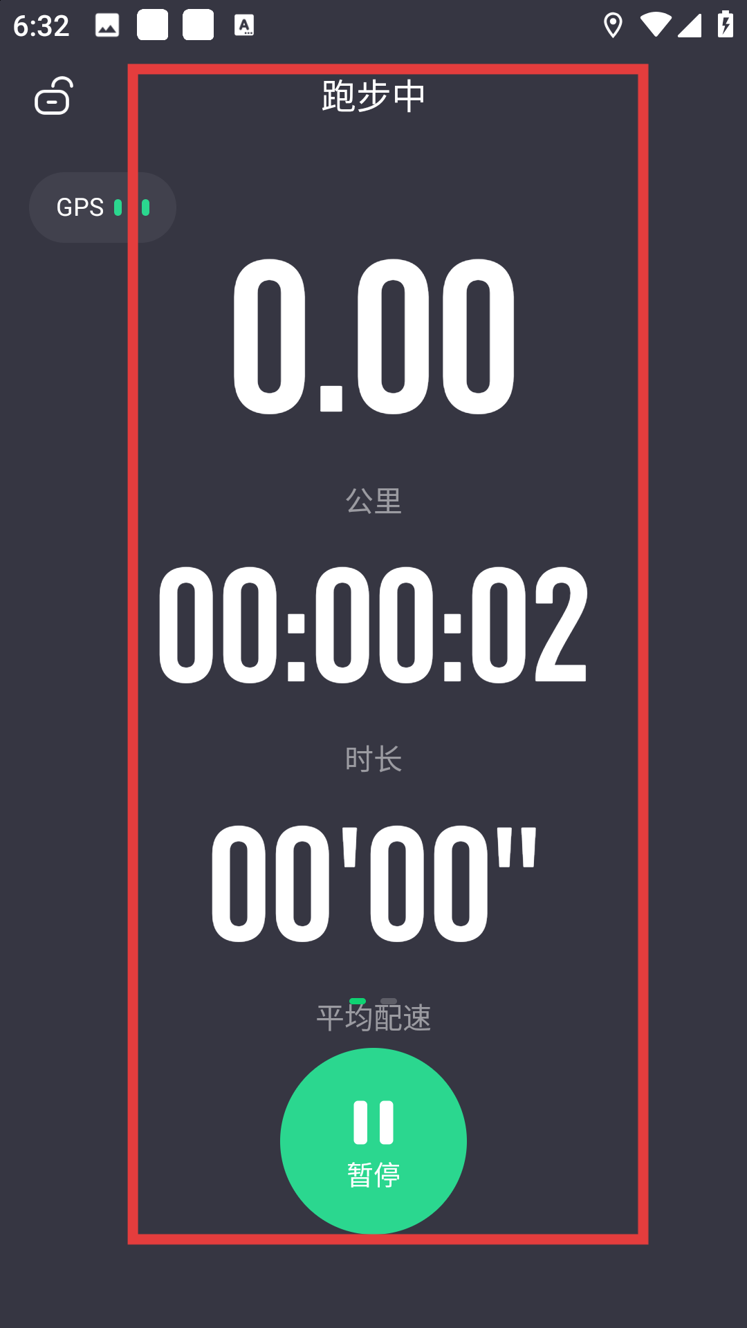3、開始戶外跑后進入跑步中界面,實時顯示公里數、時長、平均配速等數據,頂部GPS狀態標識信號,跑步中可點擊底部暫停按鈕,暫?;蚧謴瓦\動記錄。