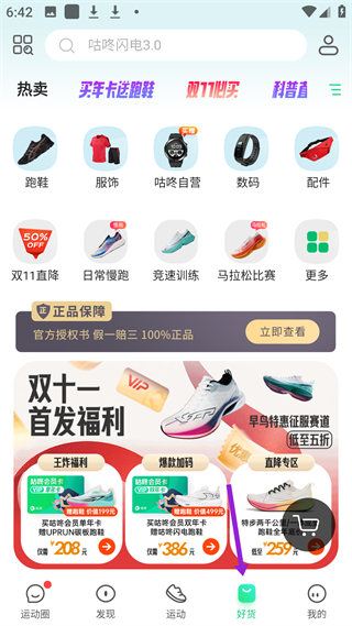 1、好貨頁有跑鞋、服飾等分類,雙11有首發福利,買會員年卡、雙年卡送跑鞋,還有直降專區,商品有正品保障。