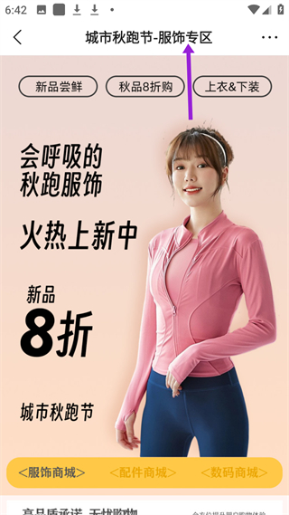 2、城市秋跑節服飾專區,會呼吸的秋跑服飾火熱上新,新品8折,有新品嘗鮮、秋品8折購等活動,分服飾、配件數碼商城。
