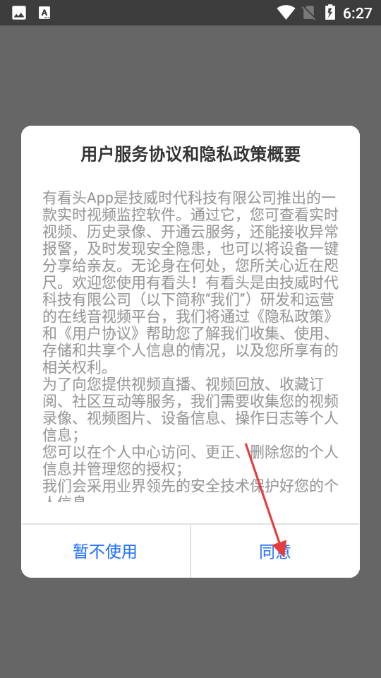 1、打開有看頭會彈出用戶服務協議和隱私政策概要窗口,閱讀后若同意條款點擊同意,這是使用App服務的基礎,確認后才能進入后續注冊流程。