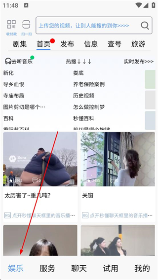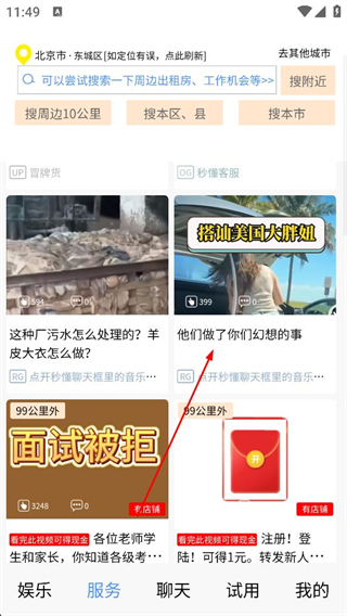 2、切換至服務頁面,查看定位區域的相關內容,選擇搭訕美國大胖妞對應的視頻,點擊進入該視頻的播放界面。
