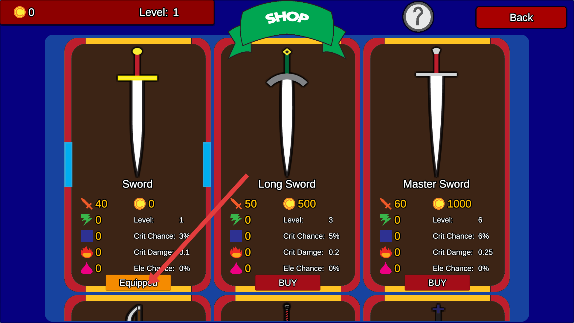 1、進入游戲后可點擊SHOP進入商店界面,這里有不同的武器可供選擇,每種武器有不同的攻擊力、暴擊率等屬性,購買后點擊Equip裝備武器,提升火柴人的戰斗能力。