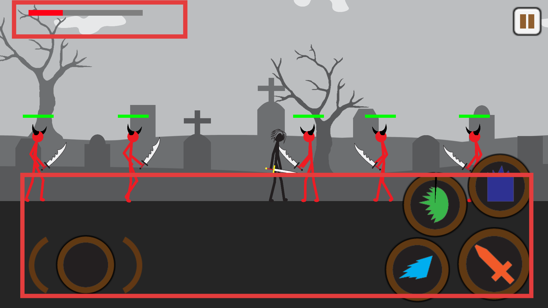 3、戰斗場景上方紅色條是你的生命值,下方有攻擊、技能等操作按鈕,點擊對應按鈕火柴人就能發動普通攻擊或釋放技能,要靈活運用攻擊和技能消滅敵人。