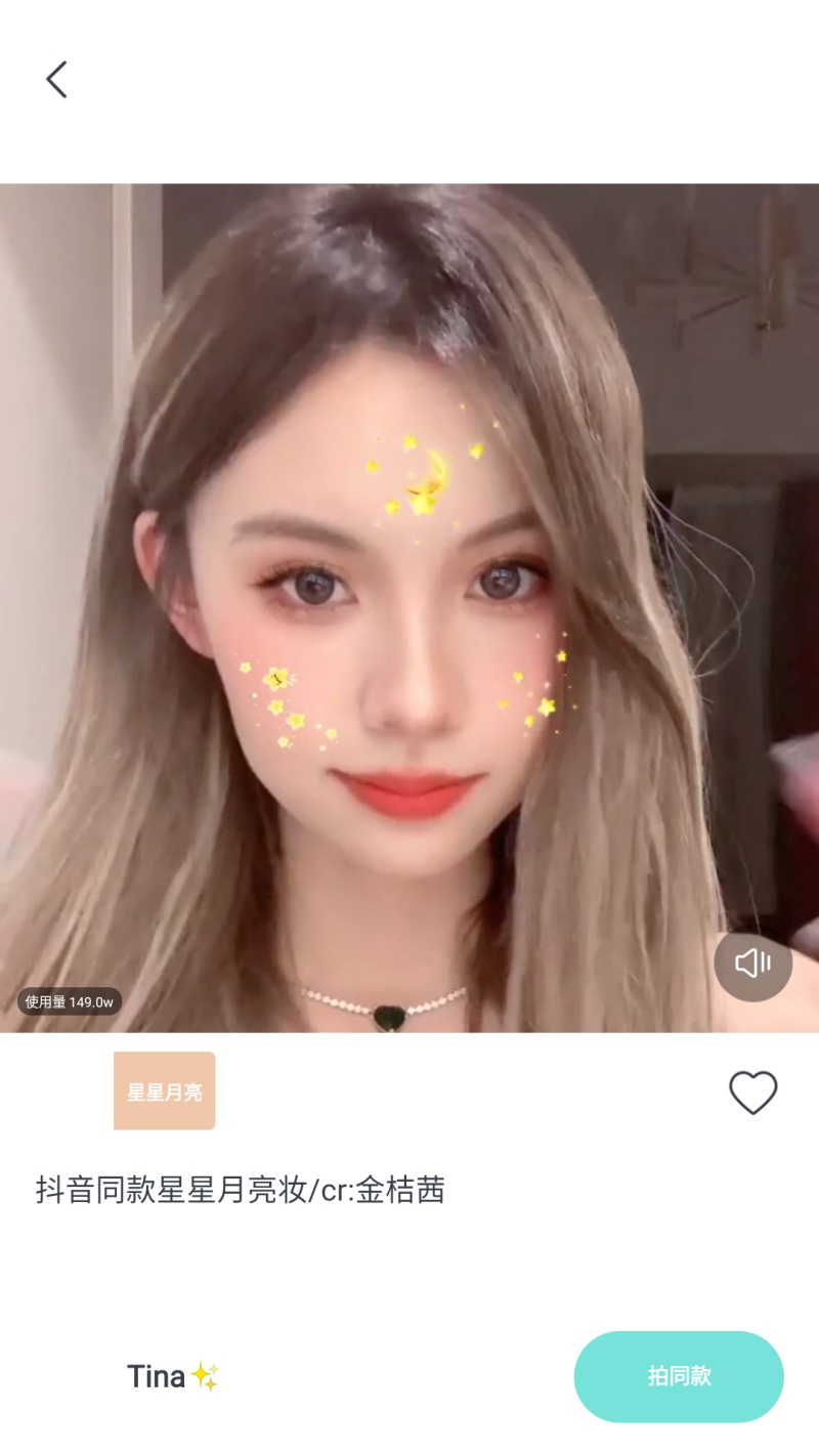 3、點擊抖音同款星星月亮妝,可查看該效果的展示視頻,點擊拍同款,即可使用該效果進行拍攝,打造同款妝容效果。