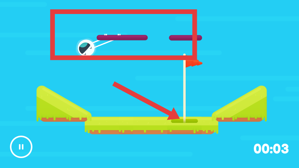 2、進入關卡后通過點擊、滑動屏幕等操作,讓白色小球借助紫色橫桿等場景元素,調整移動方向和軌跡,朝著插有紅旗的目標洞前進。