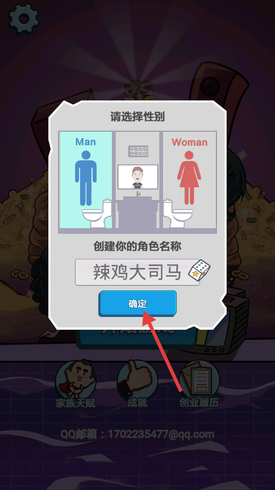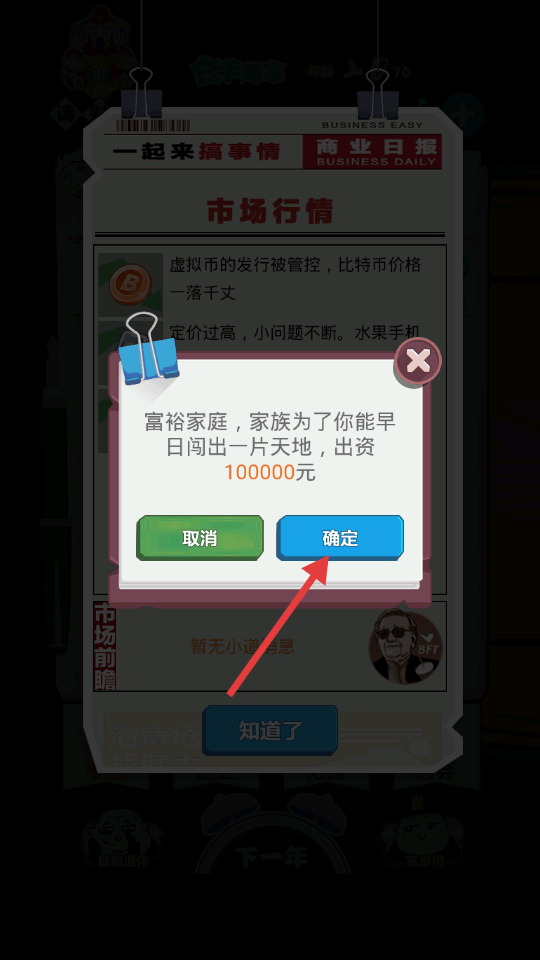 2、角色創建完成后會彈出提示框,顯示來自富裕家庭的出資金額,點擊確定按鈕就能接收這筆初始資金,這筆資金是初期進行商業活動、投資等操作的重要啟動資金。