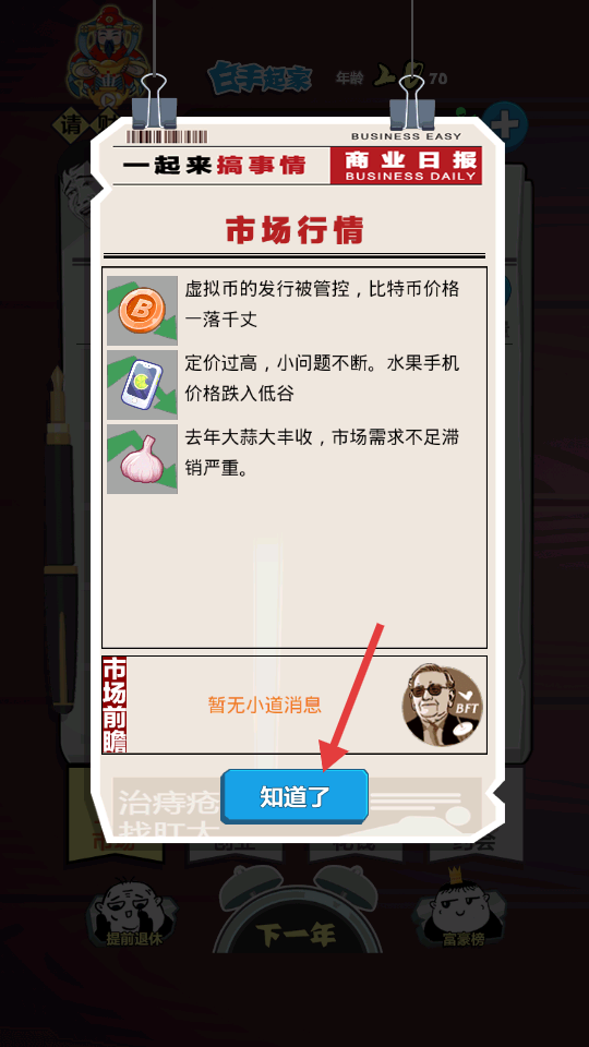 3、接收初始資金后會出現市場行情的提示界面,上面顯示了各類商品的市場情況,仔細查看這些信息后點擊知道了按鈕,以便后續根據行情進行投資決策。
