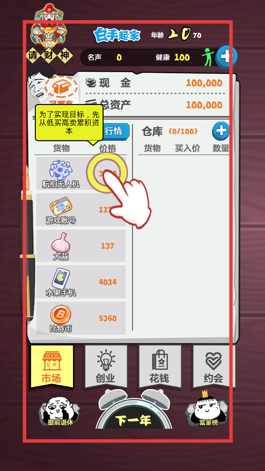 4、了解市場行情后就進入到游戲的主界面,這里顯示了現金、總資產等信息,還有各類可投資的貨物及其價格,開展你的暴富第一步投資操作。