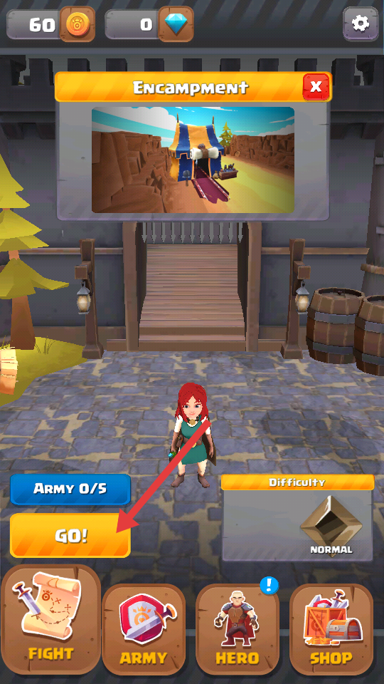 1、在主界面左側表示可攜帶的軍隊數量,點擊GO按鈕即可進入戰斗,下方的FIGHT、ARMY、HERO、SHOP按鈕,方便你在戰斗前進行各項準備。