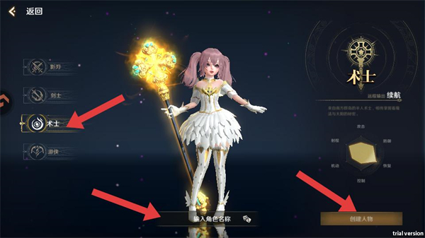 1、可選擇術士等職業,輸入角色名稱后,點擊創建人物,就能生成屬于自己的角色,開啟游戲旅程。