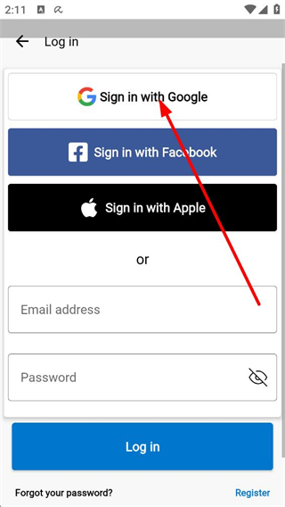 2、登錄界面,可選擇通過Google、Facebook或Apple賬號登錄,也可輸入郵箱地址和密碼進行登錄,若忘記密碼可點擊找回,新用戶可注冊賬號。