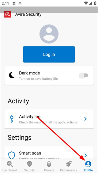 1、打開AviraSecurity,進入Profile板塊,可看到登錄入口,還有深色模式開關、活動日志等功能,便于管理個人賬戶和查看應用操作記錄。