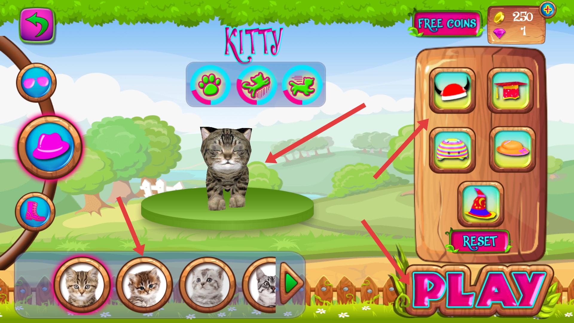 1、游戲界面可選擇貓咪形象,還能為貓咪搭配帽子等裝飾,右側有多種帽子樣式可選,裝飾好貓咪后,點擊PLAY按鈕即可進入游戲模式。