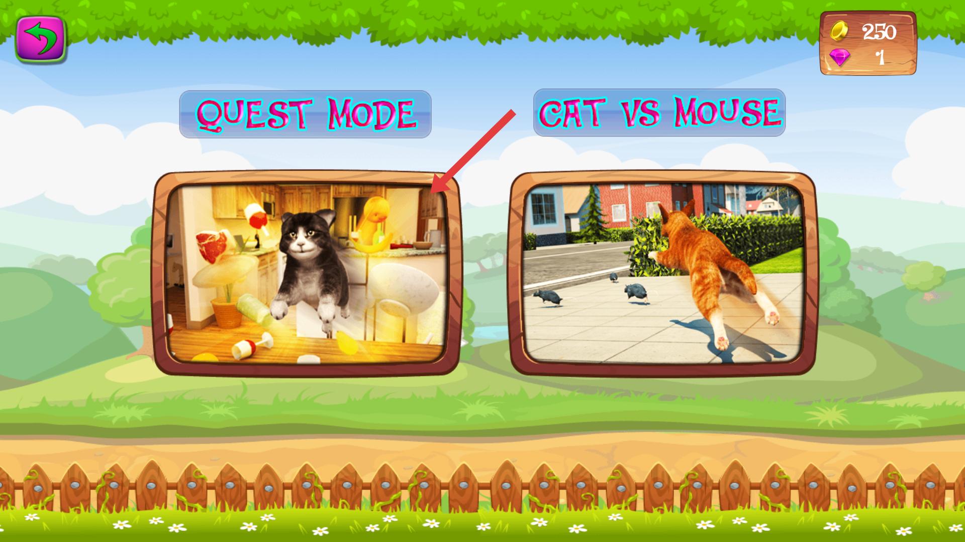 2、進入游戲模式選擇界面,有任務模式和抓老鼠兩種模式,選擇任務模式能進入任務類游戲場景,開啟貓咪的任務挑戰之旅。