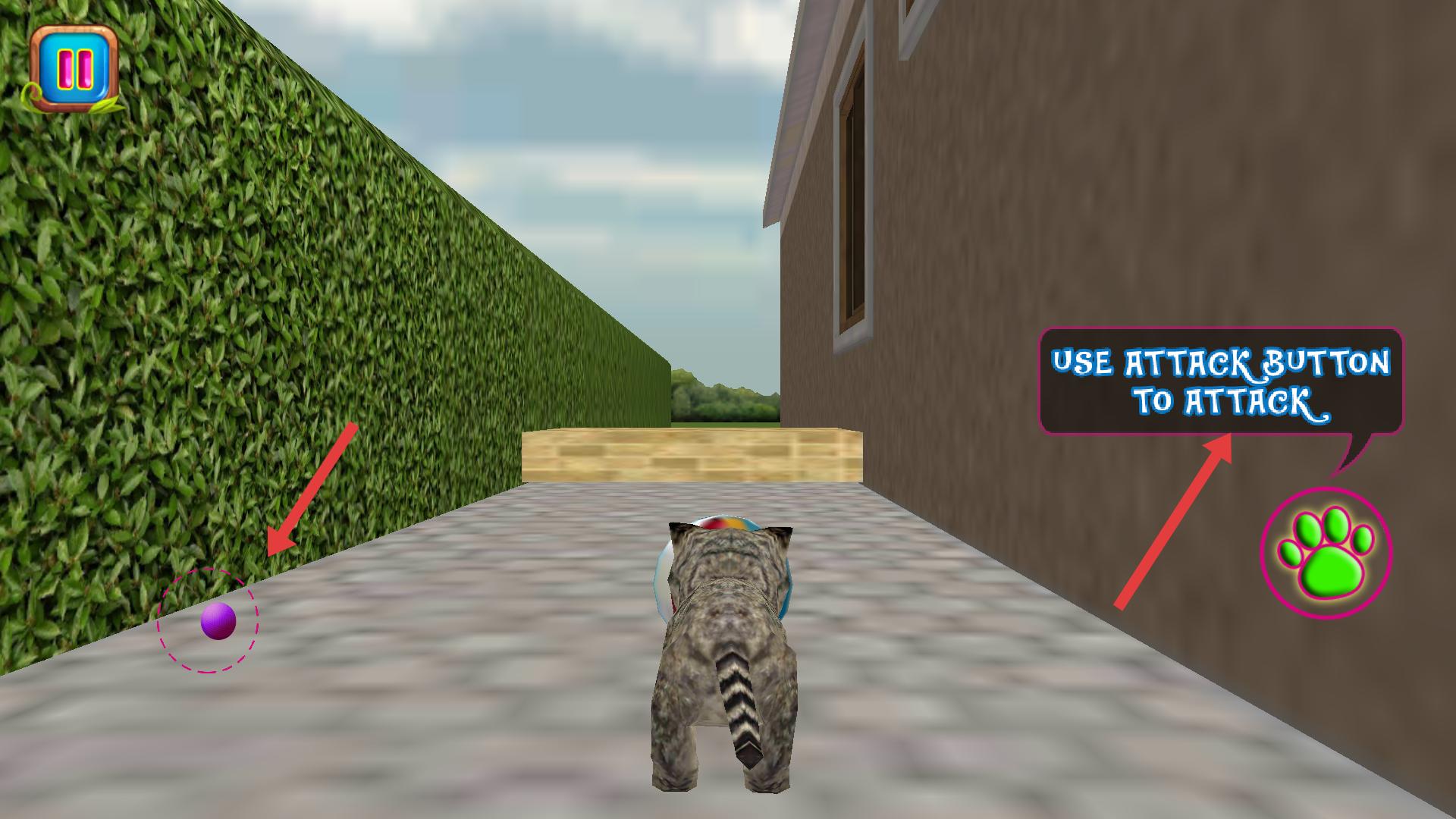 3、游戲場景界面提示用攻擊鍵攻擊,看到綠色爪印攻擊按鈕,遇到敵人或可互動目標時,點擊該按鈕,讓貓咪發起攻擊,推進游戲進程。