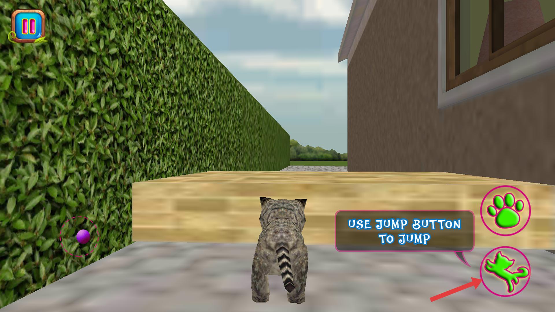 4、遇到木板等需要跨越的障礙物時界面提示用跳躍鍵,點擊綠色貓咪跳躍按鈕,控制貓咪跳躍越過障礙物,繼續在場景中探索前進。