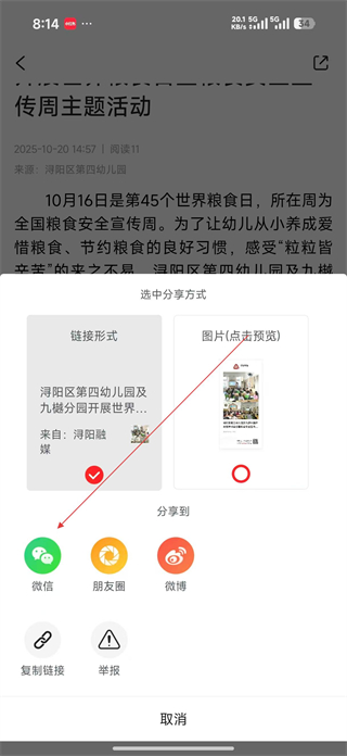 4、在分享界面選擇鏈接形式再點擊微信選項,將該資訊鏈接分享至微信,方便他人查看幼兒園的主題活動內容。