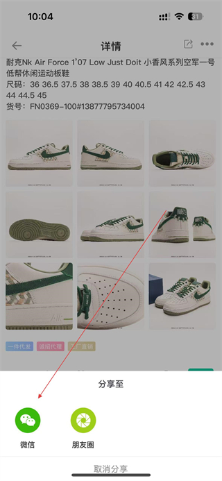 4、點擊詳情頁的分享按鈕在彈出的選項中選擇微信渠道,將該潮品信息分享給對應好友,完成分享。