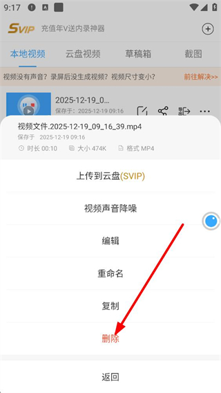 3、展開操作選項后,可選擇上傳到云盤視頻聲音降噪編輯重命名復制或刪除等功能,按需對錄制的視頻文件進行對應操作。