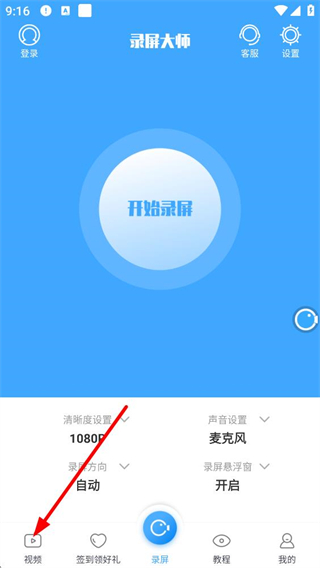 1、錄屏界面確認清晰度1080P、聲音麥克風、錄屏方向自動、懸浮窗開啟后,點擊開始錄屏啟動錄制,錄制完成后可點擊底部視頻選項查看文件。