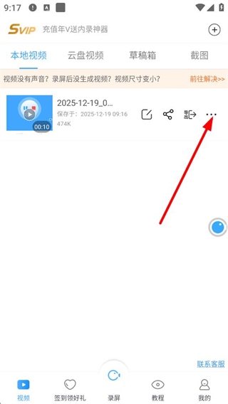 2、進入視頻頁面后,可看到本地視頻云盤視頻等分類,找到已保存的錄制文件,點擊文件旁的更多按鈕,可展開操作選項進行后續處理。