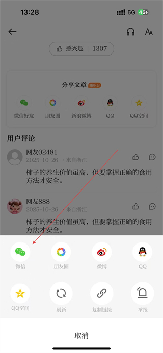 4、閱讀文章后點擊分享按鈕,在彈出的分享選項中選擇目標平臺,完成分享。